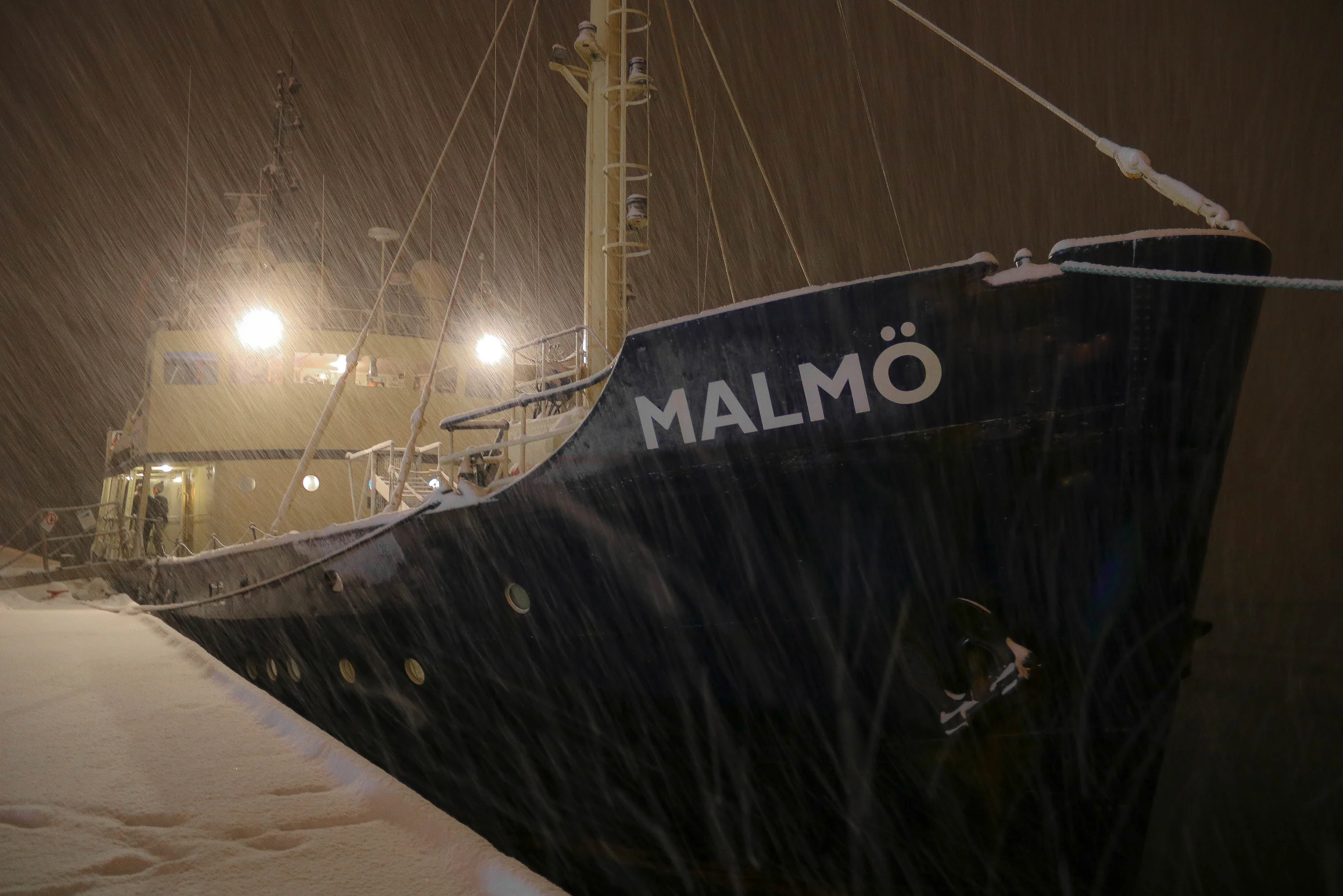 We embark the charming Malmö in the port of Narvik, and that same evening we plan the next day and try on our dry "D9 waterproof" suits. The vision of a snow covered ship when day is night, is a rare sight on a snorkelling trip!