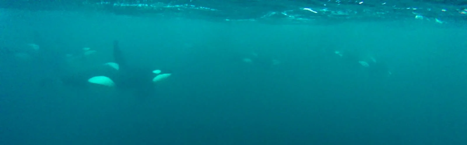 Just 3 fins above water, but about 10 orca under the surface! My mind had barely registered the reality of what I was looking at, that I was already hypnotised. My body took over, and instinctively I swam their way. Swimming as fast as I could with my flippers, I keep up with a pod of 10 Orca, including a baby about the length of a human.
