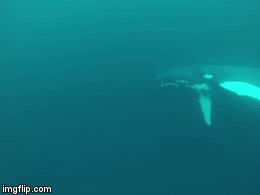 They are on the move, disappearing into the far blue distance. I haul myself back onto the zodiac, and we cruise a little further. I'm back in the water as soon as I can, and we encounter the Humpback Whales. If apprehension was my previous feeling, this time it was verging on fear from the sheer mass of the creature. The next thing I knew, I was looking down under water, at 3 whales, cruising along 20m under me. Any possible fear is dissipated by this calm and harmless hypnotic spectacle. One starts shifting right under me, and starts rising slowly. How far is it going to rise, and has it seen me? Just as I think this, the whale tilts over to look at me, and begins to make a U-turn. It moves its mass through the water with such deliberate ease, the movement is akin to a giant manoeuvring truck. It rolls over to display its bright white under belly, and powers on into the distance with its hunting partners.